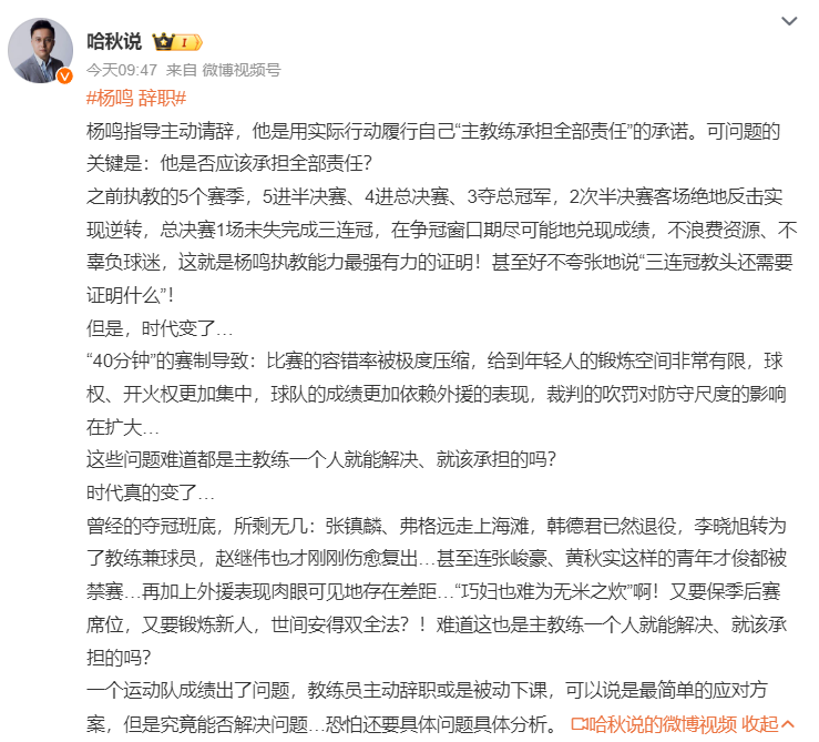 杨鸣指导还在个人社媒上致歉:最近球队的表现真心对不住球迷的支持,让大家很失望,我非常内疚和惭愧。