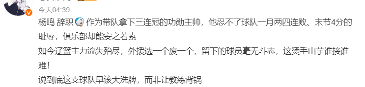 大V们纷纷不满辽篮管理层的做法,他们认为杨鸣沦为了俱乐部的替罪羊: